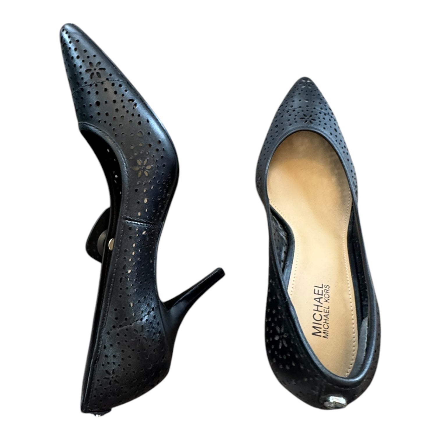 Command the room in sleek black Michael Kors kitten heels.